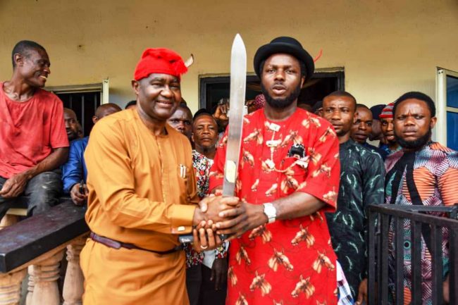 . Senator Magnus Abe during a visit to the Gberemene of Gokana Kingdom, King Festus Paago-Bagia, Gberesaakoo XIII, received a sword from the King at his palace, indicating readiness to run for the office of the governor of Rivers State.