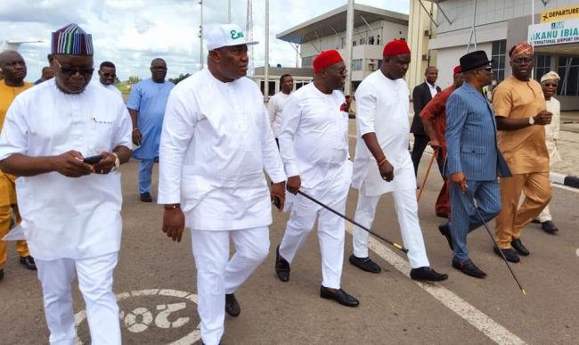 The Gov. Nyesom Wike led group were received at the Akanu Ibiam Airport by the Enugu State Gov. Ifeanyi Ugwuanyi.