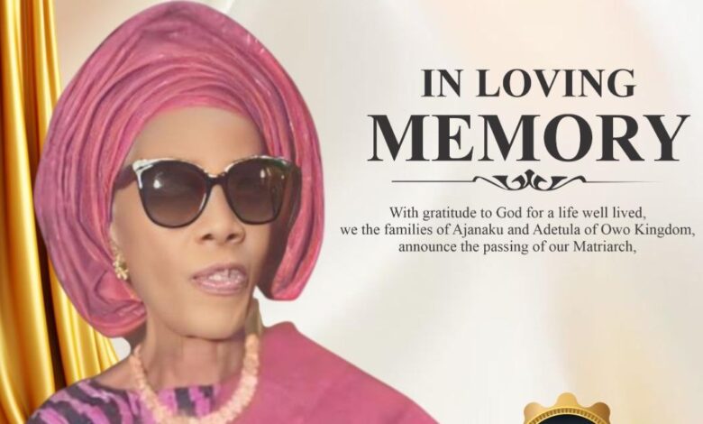 On Wednesday, April 15, 2026, a Service of Songs will be held at the Ayiwobu Conference Centre, Mydas Hotels & Resorts, Owo, Ondo State, from 4:00PM to celebrate the life and times of the revered Matriarch, while on Thursday, April 16, 2026, the Lying-in-State will begin at 2:00PM at the Ajanakus’ compound, Isolo Street, Owo.