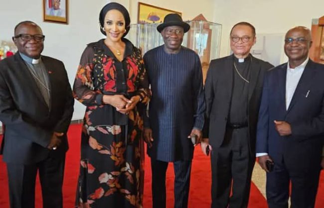 L-R: Bishop Mathew Hassan Kukah, Bishop of Sokoto Diocese, Amb. Bianca Odumegwu-Ojukwu, Minister of State for Foreign Affairs, Dr Goodluck Ebele Jonathan, former President of Nigeria, Archbishop Lucius Ugorji, President of Catholic Bishops Conference of Nigeria, Amb. Innocent Iwejuo, Director, Ministry of Foreign Affairs, at the Presidential Wing of Nnamdi Azikiwe International Airport,