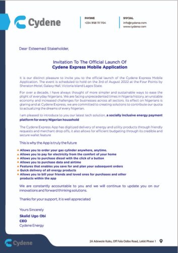 “With Cydene Express App, you can order cooking gas, fuel, diesel, airtime credit and electricity tokens from the comfort of your home.