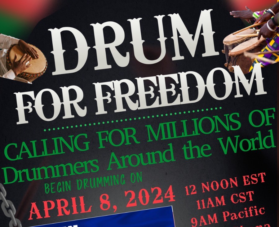 The “Drum for Freedom” campaign is calling for millions of drummers from around the world to begin drumming on Monday, April 8, 2024 from 12 noon (EST), 11am (CST), 9am (Pacific), 4pm (Ghana), and 6pm (Kinshasa).