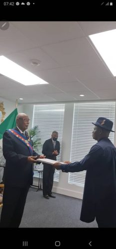 While receiving his credentials, His Excellency Cornelius Alvin Smith warmly congratulated and welcomed Ambassador Okoyen to The Bahamas and wished him every success in his responsibilities as Nigeria’s High Commissioner to the Commonwealth of The Bahamas. He further extended his warm greetings to President Buhari and expressed his government’s desire to move relations between the two countries higher during Ambassador Okoyen’s tour of duty in the Bahamas.
