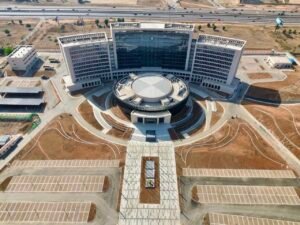 Inside, it houses offices, meeting rooms, and a wide range of facilities, including a data centre, training rooms, a medical unit, childcare services, a gym, a library, and dining areas.