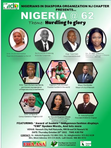 Being organised by the New Jersey Chapter of the Nigerians in Diaspora Organisation Americas (NIDOA), the program has as its theme, “Hurdling to Glory” and will have Dr. Yetunde Odugbesan-Omede, Professor of Global Affairs and Political Science as the Keynote Speaker.