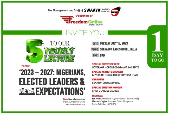 The fifth yearly lecture of Freedom Online, one of Nigeria’s fastest-growing online newspapers, will hold on Tuesday July 18 in Lagos.