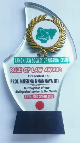 The Vice Chancellor of the Federal University of Technology (FUTO), Owerri, Imo State, Professor Nnenna Oti, has been honoured with the Rule of Law Award by the Canon Law Society of Nigeria (CLSN) at its 37th Annual Convention held in Imo State, Nigeria recently.