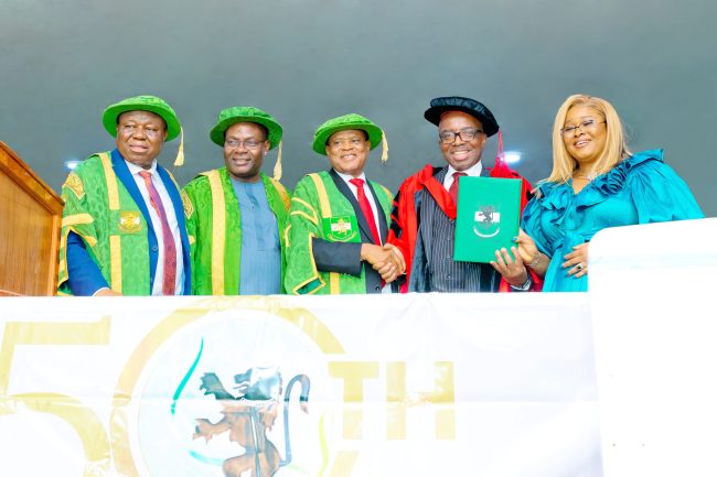 Other recipients of Doctorate Degrees at the 50th convocation ceremony include former Governor of Delta State, Dr. Emmanuel Uduaghan, who was conferred with the Doctor of Public Administration, and the Chairman of Hobark International Limited, Dr. Obiora Fubara, who received the Doctor of Business Administration. A retired Justice of the Supreme Court of Nigeria, Justice Mary Odili, was conferred with the Doctor of Law; however, her conferment was deferred to a later date because she was unavoidably absent at the ceremony.