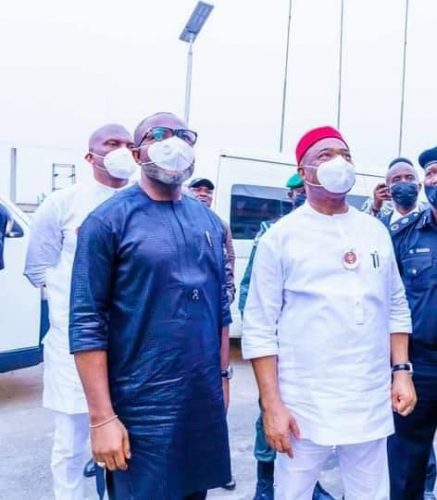Gov. Hope Uzodimma and Speaker Imo House of Assembly Rt. Hon. Kennedy Ibeh during the inspection of the renovation of Imo House of Assembly complex on Tuesday