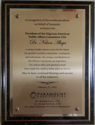 Dr Aluya is the National President of the Nigerian American Public Affairs Committee USA (NAPAC USA), the immediate past president of the New Jersey Medical Association (NJMA),the immediate past Chairman of the Association of Nigerian Physicians in the Americas (ANPA), President and CEO of HopeEdge International and the Vice President of Impact Life International, both of which are Non Governmental Organizations (NGOs) with global presence.