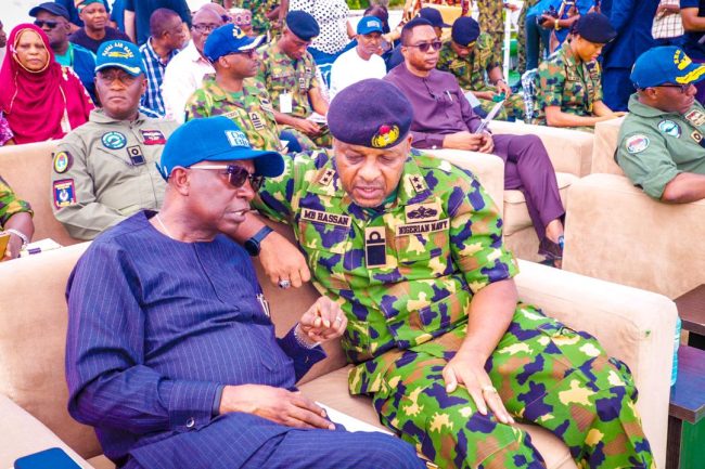Director General, Nigerian Maritime Administration and Safety Agency, NIMASA, Dr. Dayo Mobereola (left) and Flag Officer Commanding, Western Naval Command, Rear Admiral Mustapha Hassan during the Deep Blue Security Capability Demonstration exercise in Lagos