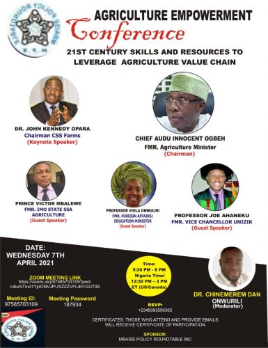 The Mbaise Policy Roundtable (MPR), a non-governmental organization with offices in Owerri Imo State, Nigeria and New York, USA, will convene a Zoom conference on Agriculture to educate and empower the unemployed and underemployed youths particularly of Mbaise, Imo State and indeed the South East of Nigeria.