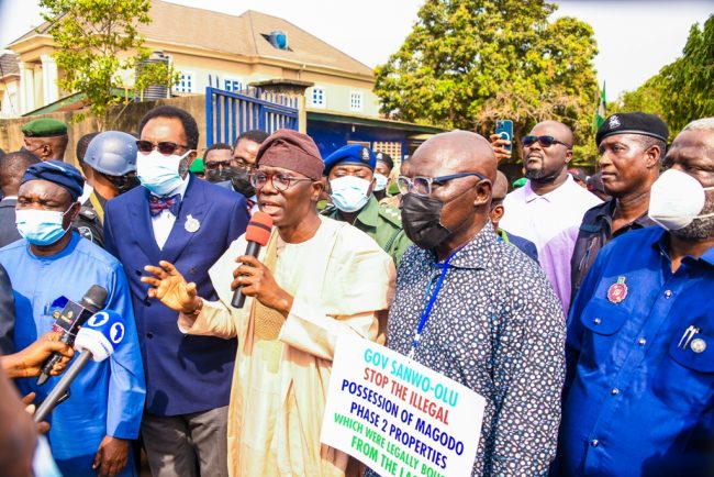 Lagos State Governor, Mr. Babajide Sanwo-Olu (middle) addressing residents of Magodo Phase II protesting against possession of their properties, on Tuesday, 04 January 2022. With him: Commissioner for Information & Strategy, Mr. Gbenga Omotoso, the Attorney General/Commissioner for Justice, Mr. Moyosore Onigbanjo (SAN) and Commissioner for Physical Planning & Urban Development, Dr. Idris Salako (right).
