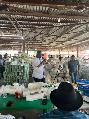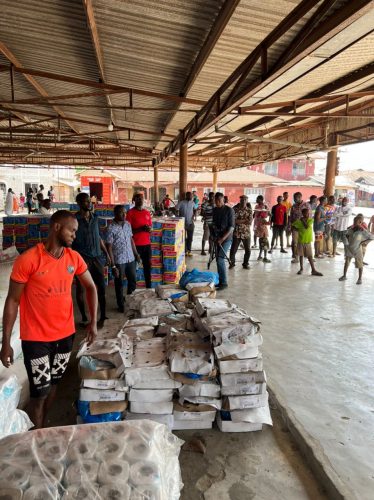 Some of the items delivered to the community include 200 bags of rice, 100 bags of garri, 50 bags of beans, 200 bunches of plantain, 200 tubers of yam, 200 cartons of indomie noodles, 200 cartons of chicken, 500 cartons of water, groundnut oil, palm oil, toilet paper, seasoning, salt, blood pressure machines and salt testing kits.
