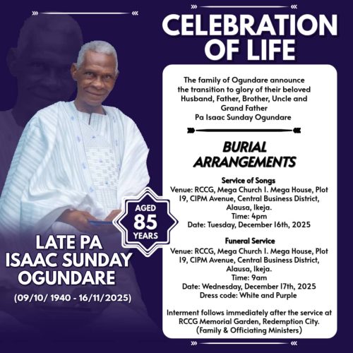 This will be followed by a Funeral Service at the RCCG, Mega Church I. Mega House, Plot 19, CIPM Avenue, Central Business District, Alausa, Ikeja, Lagos, on Wednesday, December 17, 2025 from 9:00 am.