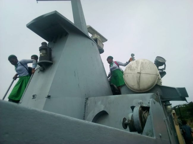 Some students exploring a relic at the National War Museum, Umuahia during the Children’s Day celebration.
