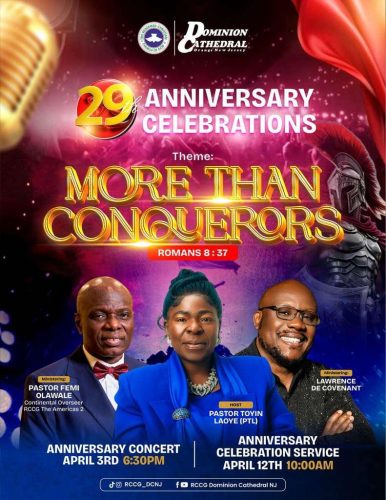 With the theme, “More Than Conquerors,” the anniversary celebration, according to the Senior Pastor of the Church, Assistant Continental Overseer (ACO), Pastor (Dr.) Toyin Laoye, is expected to attract dignitaries from across the United States of America (USA) and far beyond, to take part in the different activities lined up for the ceremony.