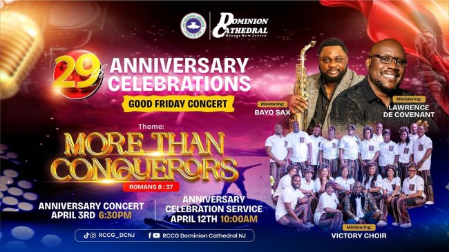 The Redeemed Christian Church of God (RCCG), Dominion Cathedral, Orange, New Jersey, United States of America (USA) has commenced activities that will culminate in the grand celebration of the 29th Anniversary of her birth, taking place on Sunday, April 12, 2026, with the Continental Overseer, RCCG The Americas 2, Pastor Femi Olawale, ministering.