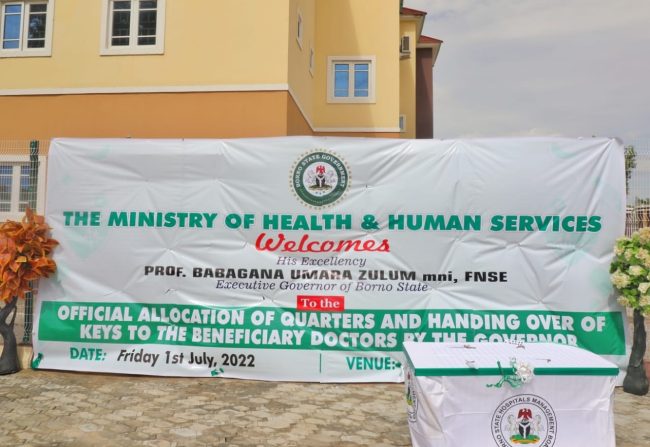 Borno State Governor, Professor Babagana Umara Zulum on Friday in Maiduguri, handed over 81 units of three-bedroom apartments along with cheques worth a total of N79m to 81 resident medical doctors.