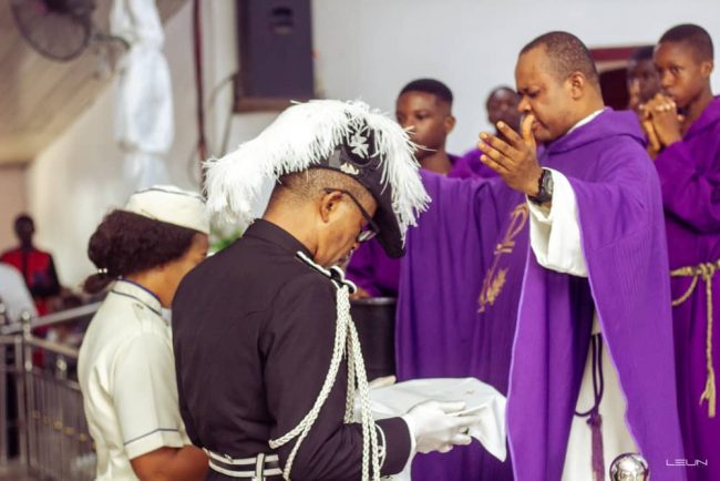 Knights and Laux of St John International, Uyo Grand Commandery on Sunday December 5, 2021 were led in Thanksgiving Mass at St Fabian Police Catholic Chaplaincy, Eket, Akwa Ibom State by the Ede of Okpekpe Kingdom in Etsako East Local Government Area, Edo State, Engr. (Sir) Donaldson and Lady (Dr.) Blessing Eshilama.