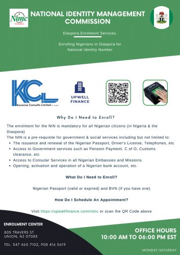 Upwell Finance and Kevonne Consults Ltd., which are partnering with the National Identity Management Commission (NIMC) to facilitate Diaspora Enrolment Services, especially in the United States of America (USA) gave insights into why compatriots must enroll for the NIN in a statement made available to GPNEWS in New Jersey, USA.